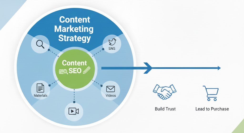 コンテンツマーケティングとは、商品やサービスの直接的な宣伝ではなく、顧客に価値ある情報を提供して信頼関係を築き、自然な流入や購買につなげる手法です。